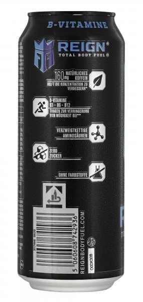 Koffeinhaltiges Erfrischungsgetränk mit Himbeergeschmack. Reign ist mit Koffein und B-Vitaminen hergestellt. Koffein hilft, die Aufmerksamkeit zu steigern und die Konzentration zu verbessern. Niacin, Vitamin B6 und Vitamin B12 können zur Verringerung von Müdigkeit und Ermüdung sowie zu einem normalen Energiestoffwechsel beitragen. Vitamin B6 trägt zu einem normalen Eiweiß- und Glycogenstoffwechsel bei.