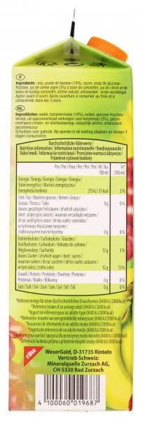 Banane-Kirsch Getränk. Teilweise aus Fruchtsaftkonzentrat. Fruchtgehalt: 22%.